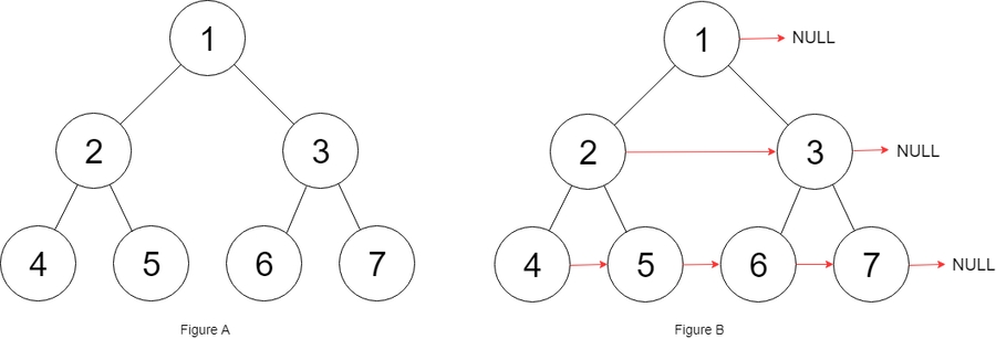 Given the above perfect binary tree (Figure A), your function should populate each next pointer to point to its next right node, just like in Figure B. The serialized output is in level order as connected by the next pointers, with '#' signifying the end of each level.Example 2: