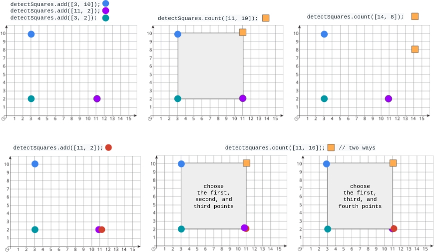 detectSquares.add([11, 2]); // Adding duplicate points is allowed.